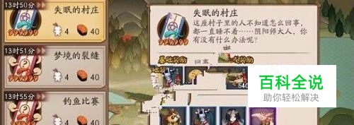 阴阳师式神委派任务搭配:式神委派任务有四个,如果没有委派式神,委派任务刷新是四小时(还是五小时,没注意看)。每个委派有任务描述和推荐式神,拍出跟描述相关的式神,任务成功率会提高。 梦境的裂缝和钓鱼比赛,推荐式神是隐藏的,需要玩家自己猜哪个式神合适,如果选中了合适的式神,问号图标会变成对应式神的小头像。钓鱼比赛的四个式神是荒川、惠比寿、海坊主,第四个放了鲤鱼精和河童都没有显示,不知道是什么。放了荒川惠比寿海坊主,任务达成率显示完美100%。 有关睡眠和梦境的应该派出蝴蝶精和食梦貘,达成率是50%-70%左右,不知道拍出巫蛊师会不会再提高一些。迷雾森林推荐了食发鬼和烟烟罗,当时我派了五个烟烟罗,达成率很低,换了不同的式神以后达成率才提高了。