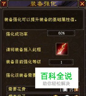功能说明:武器和装备本身也是有灵性的,在添加进特殊的材料并经过特殊的加工,就可以使得装备的属性有一定的变化,装备强化可以提升装备的基础属性。装备强化有一定几率失败,强化到1、5、7、8之后不会再回退。比如:在强化到5级后,再冲高级强化时不会回退到5级以下;在强化到7级后,再冲高级强化时不会回退到7级以下。装备强化扣取强化道具时,优先扣取背包中已绑定的强化道具,只有在背包内没有已绑定的强化道具时,才会扣除未绑定强化道具。无论强化成功失败,强化的装备仍然在强化框内,以方便玩家快捷进行下一次强化。