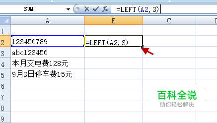 单元格中为纯数字,则提取数字的方法比较简单;比如,要提取单元格A2中的数字的前三位,则可以单元格B2中输入公式: =LEFT(A2,3) LEFT函数表示从左边提取数字,并返回指定个数的字符。