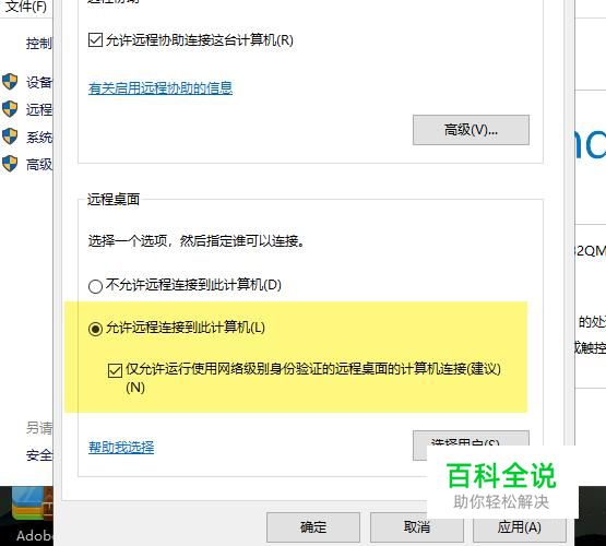 在“远程桌面”部分,选择选项允许运行使用网络级别身份的远程桌面的计算机连接。