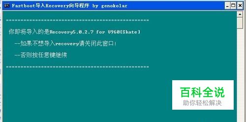 二.下载recovery5.0.2.7_v960.rar并解压到桌面,双击打开recovery5.0.2.7_v960.exe,并按提示操作。 首先会重启手机进入bootloader模式:出现开机Logo屏幕并停留不动;继续进行下一步就会刷入recovery,然后会自动重启 进入recovery的方法:按住音量下+开机键开机,并按住两键不放,直到进入新recovery。 注:recovery中,音量上键、音量下键为上下移动,电源键/小房子键为确认,返回键为返回上一级菜单