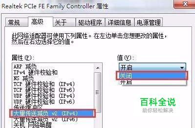 在打开的本地连接属性窗口中,点击“配置”按钮,打开Realtek PCIe FE Family Controller属性窗口,并且在该窗口中将界面切换到“高级”栏下,接着只要在高级栏中找到“大量传送减负 v2(IPv4)”并且关闭它的值即可,如下图所示: