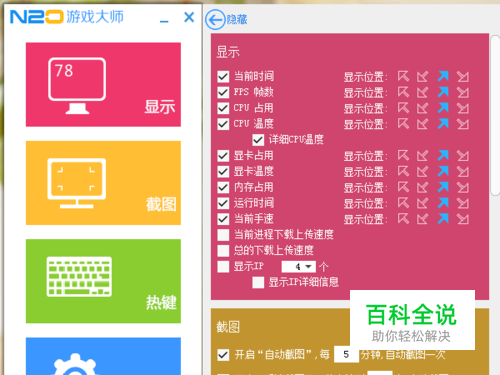 为了更好的了解我们游戏中电脑的实时数据(如显存的占用,显存的温度,CPU占用等)在此安利大家一款非常体贴的游戏辅助软件——N2O游戏大师。 首先我们打开软件,选择需要显示的项目和自己喜欢的显示位置。