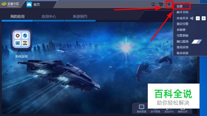 首先运行蓝叠模拟器,点击如图所示图标,选择“设置”