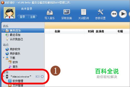 先点击这里将美图秀秀iPhone测试版下载到你电脑里。将手机连接电脑后,打开同步助手,在左侧栏会出现当前iPhone标志,并选中iPhone名称这一栏,如图选中“administrator”。