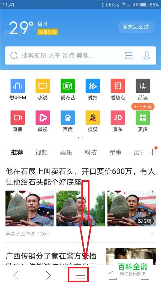 打开手机QQ浏览器进入首页,点击下方的菜单按钮。