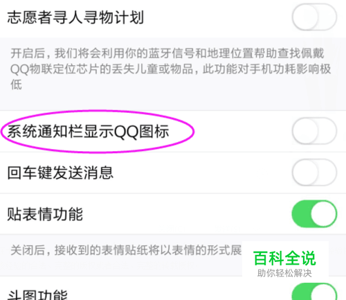 在【辅助功能】这个页面,我们看到【系统通知栏显示QQ图标】,如图。