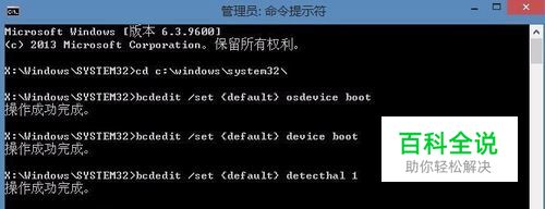 3、在命令提示符中逐一执行以下命令: cd c:\windows\system32\ 回车;bcdedit /set {default} osdevice boot bcdedit /set {default} device boot bcdedit /set {default} detecthal 1