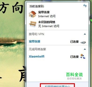 将鼠标移动到信号处,点击鼠标左键,出现以下画面,点击-----打开网络和共享中心。