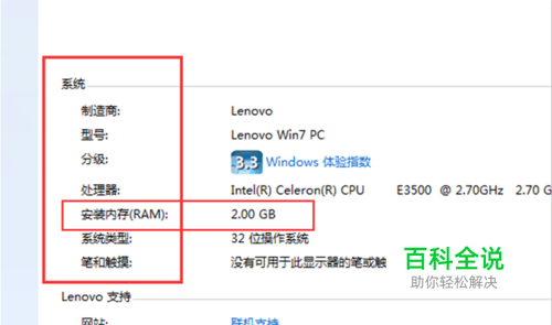 点击以后,我们就进入到我们的系统页面,如图所示,在所在区域我们就可以查看我们的系统配置了。其中就包含有你的电脑内存大小。
