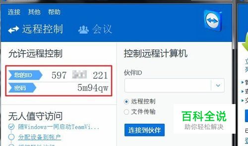 还有一点需要注意的是,左侧面板的密码是动态的,每次启动Teamviewer,改密码都是不一样的,如果没有记住最后一次密码,也是控制不了了。不过不要紧,我们可以设置一个固定密码,打开左上角的 连接,设置无人值守访问。