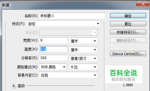 打开PS软件,新建一个9*5.5cm 像素300的文件。