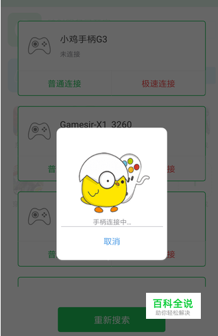 进入小鸡游戏世界,打开手机蓝牙功能,然后长按“HOME键”三秒即可开启手柄,点击手柄精灵——连接。等待数秒即可。