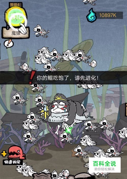 当吃东西点数满格后,左上角的按钮就可以点击啦,我们点击一下这个按钮,可以将自己的鲲进阶成功,进入到更高级的状态,如图所示
