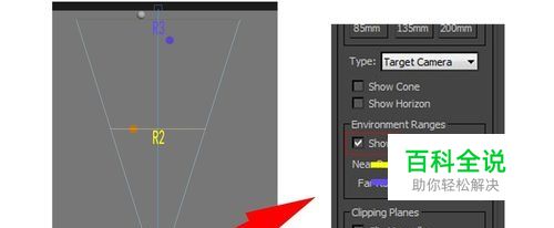 打开摄像机属性面板,找到'SHOW"一项,前面打钩。下面黄色箭头标注的数值,指的是R1到R2之间距离,蓝色箭头标注的数值,指的是R1到R3之间的距离.大家可以看到R2和R3上面都有一条灰色的线,这是对应的黄蓝箭头数值的范围线,意思是,从摄像机R1到R2灰线的位置,清晰度为百分百没有虚化,从R2灰线到R3灰线之间的距离,清晰度依次从百分百逐渐降到0,R3灰线以外,那就是全部虚化的效果(注意:摄像机SHOW数值仅仅是测量虚化距离用的,实现真正的虚化效果要使用VRayZDepth来渲染,下面有讲到)