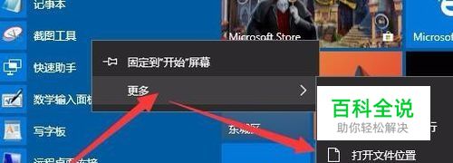 在展开的附件菜单项中找到“截图工具”的菜单项,右键点击该菜单项,在弹出菜单中依次点击“更多/打开文件位置”菜单项。