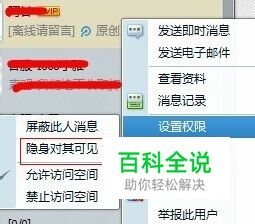 第三步:这时候,有一条是权限设置,里面有一条就是隐身对其可见。(当然前提是你先在正处于隐身状态,否则没有这一条,而是在线对其隐身)