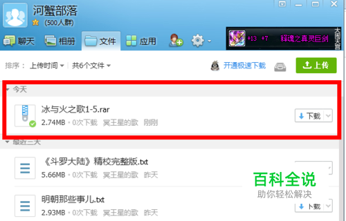 上传完成后,在“文件”栏里就会显示刚刚上传的文件分享。这样该群的所有群成员都可以下载该文件了。