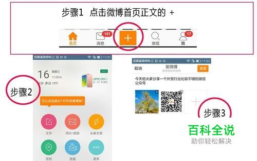 1.登录账号后进入微博首页, 2.点击 + 选择图片或文字 3.确定分享的图片和文字内容
