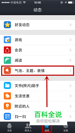 登录手机QQ,选中【动态】图标,再点击【气泡、主题、表情】。