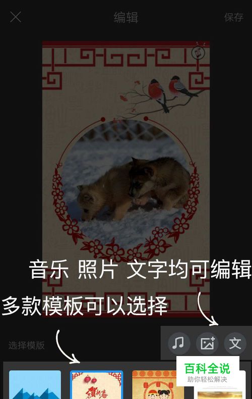 制作完成后,可以点击左上角的“保存”按钮,即可保存该音乐相册,点击编辑,可返回重新编辑,点击分享,就可以分享到微信,朋友圈等软件,点三个点那个标志,可删除该音乐相册