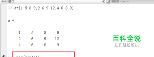第二步输入 max(max(a)),求a矩阵的最大值,如下图所示: