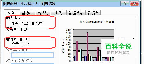 在弹出的窗口中的“图标标题”中输入“各个菌株的差异碳源下的含量”,“数值(Y)轴”中输入“含量(g/L)”,如下图所示。点击下一步,再点击完成。