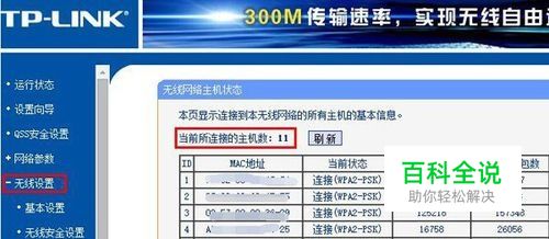 4、然后点击“主机状态”来查看当前有哪些设备通过无线连接了你家的路由器; 如果发现有外人连接了你家路由器,那该怎么办,任由他们连接吗? NO NO NO! 要让他们知道我家的WiFi可不是你想连就能连的。 还是在刚刚的“无线设置”下,有个叫“无线MAC地址过滤”,选择“启用过滤”,在过滤规则下选择“允许”,然后点击“添加新条目”,输入自己上网设备的MAC(物理)地址,然后点击保存即可。