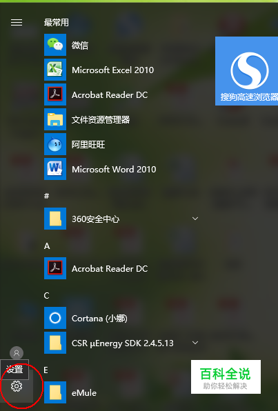 现在点击电脑的开始菜单,在开始菜单点击“设置”图标