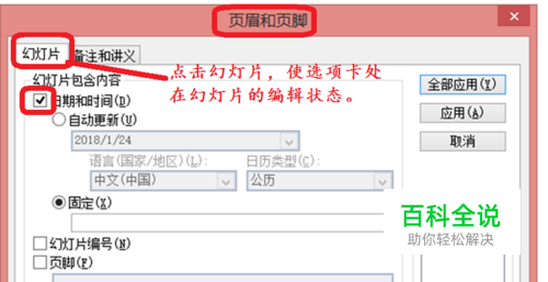 设置日期显示的区域,在页脚前打勾,一般标题幻灯片也不显示,在其前面打勾即可。最后,点击全部应用,就完成了ppt日期时间的设置。