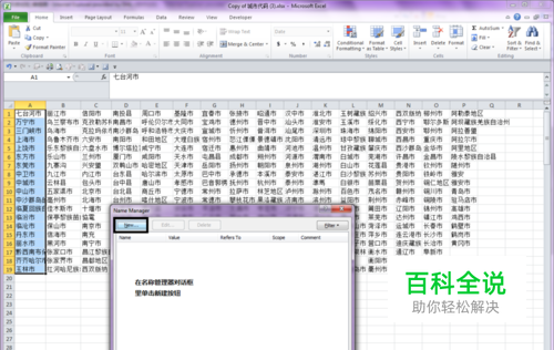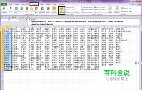 在名称那里把这个区域 命名为“城市”,然后单击确定。退出名称管理器。此时我们发现下面引用的区域就是我们刚刚选定的A1:A19