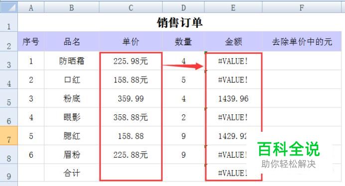 如下图所示:销售订单中,单价列,有带“元”的单元格,则金额处无法相乘得出销售额;