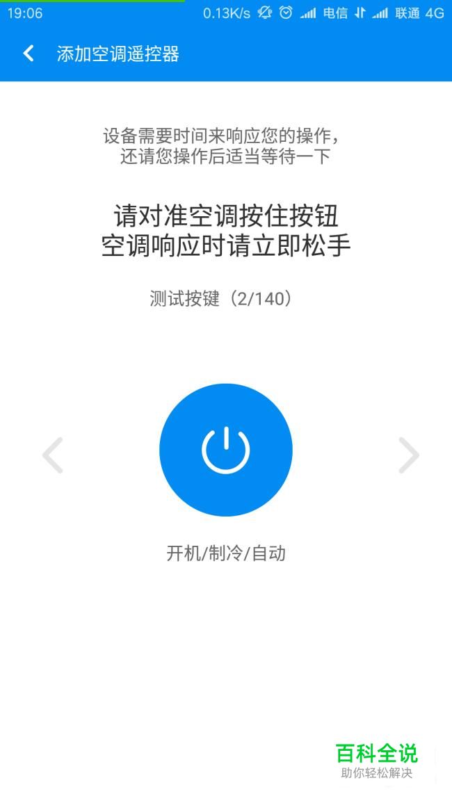 按照提示测试按键,对准空调,按住屏幕中心的测试按键不要松手。等待下一步提示。