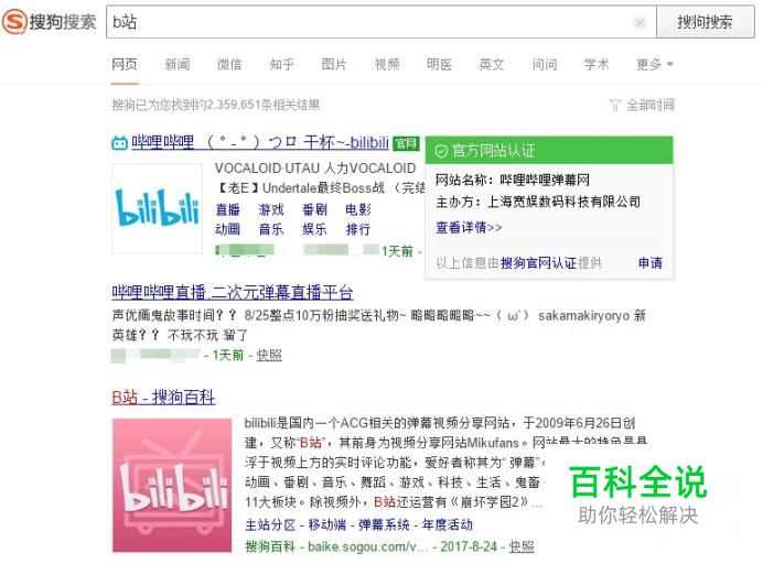打开搜狗搜索,输入b站关键字,进行搜索后查看结果。