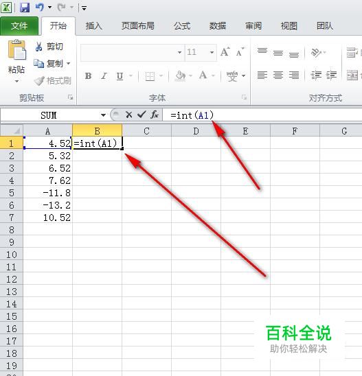 定位好B1单元格,然后在编辑栏输入公式=int(A1),注意,要在英文状态下输入。