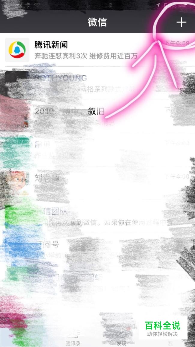 打开微信,进入主界面,点击右上角的“+”按钮;