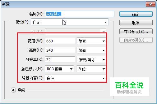 我们需要建立一个新的画布,这里我们建立一个650*340尺寸的画布。