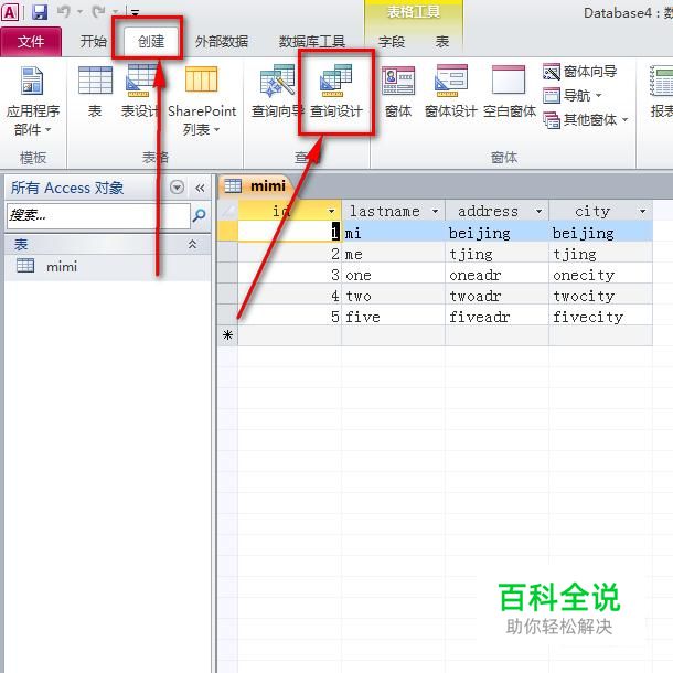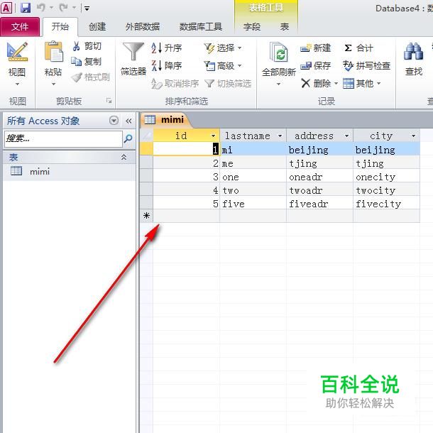 如图,在Microsoft access新建一个数据表,这里我就随便创建了一个数据表mimi,里面包含有字段id,city,lastname等等。