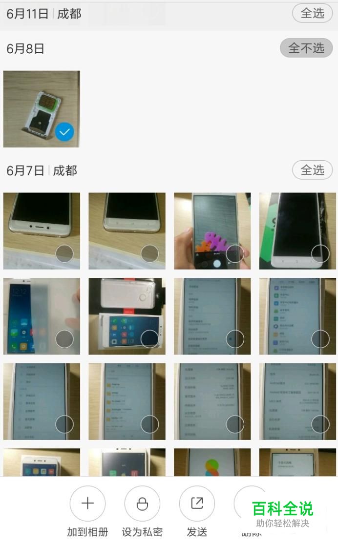 打开小米手机的相册,长按选中要隐藏的照片,可以多选,然后在下方选项中选择“设为私密”。