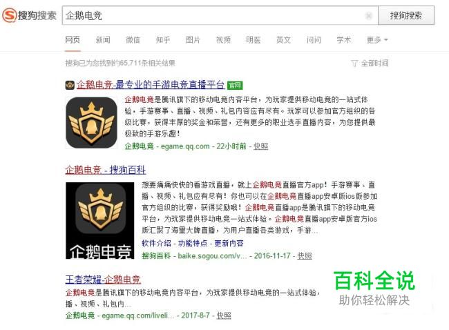 打开搜狗搜索,输入企鹅电竞关键字,查看搜索结果。