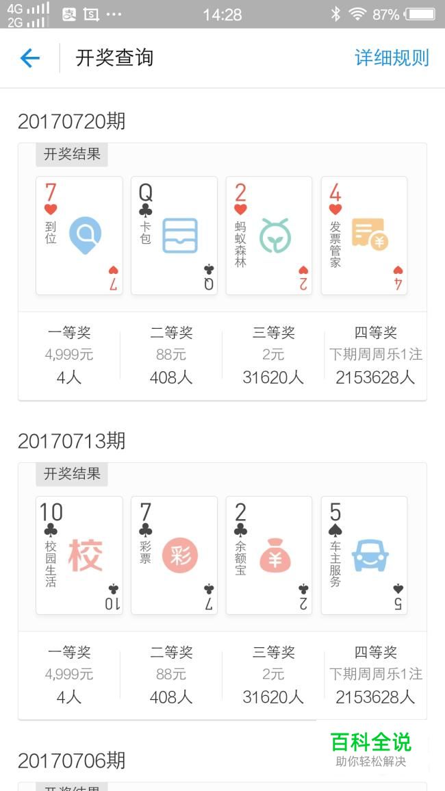支付宝周周乐是支付宝的一个开奖活动,通过支付宝付款或者使用积分兑换可以获得周周乐,每周三开一次奖,最高可以获得4999元,支付宝周周乐在哪里看呢?
