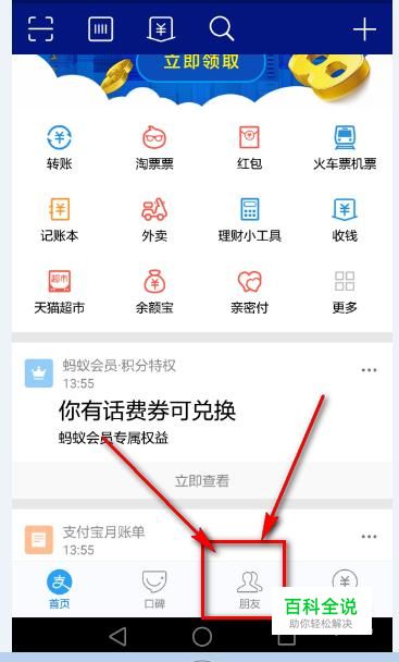 首先,登录自己的手机支付宝,然后在支付宝首页点击”朋友”这个图标。