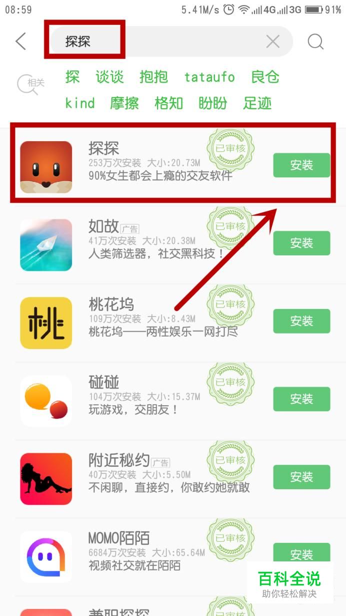 首先,来到应用中心,搜索到“探探”,点击“安装”~