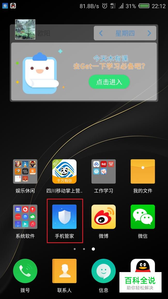 现在手机都会自带有管家类的安全应用,我们在主页面点击打开“手机管家”。
