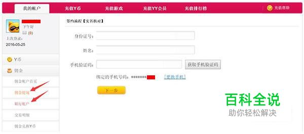 登录多玩充值平台pay.duowan.com,打开“我的账户”,点击左菜单的“佣金”,点击“佣金提现”,输入身份证号、姓名、手机验证码后点击下一步。