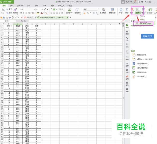 首先打开需要合并单元格的excel表格,选定表格区域对数据进行排序(如下图);