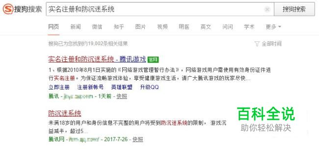 打开搜狗搜索,输入实名注册和防沉迷系统关键字。