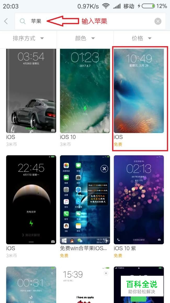 在搜索栏里输入“苹果”并搜索,点击想要改变的主题。