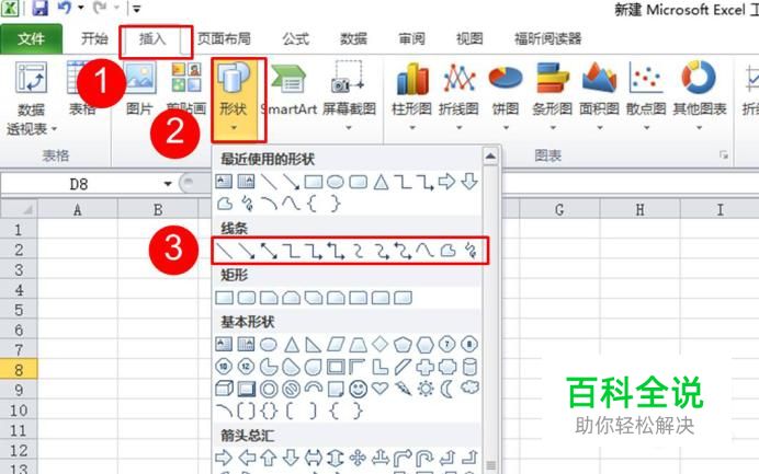 选择插入线条形状 在Excel表格的菜单栏中选择【插入】,然后选择【形状】,接着在图示3位置的红色实线框内选择任意一种线型,总共有12中线型可供选择,我们这里举例选择的线型为第1种,大家可以根据自己的需求选择相应的线条类型(绘制方法都是一样的)。
