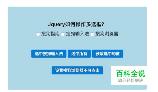 第四个按钮的逻辑,设置一个多选框为不可用状态,在这个状态下,用户不能点击选中它。 我们用id选择器选中这个选项,然后用prop方法,设置 disabled属性为true就行了。